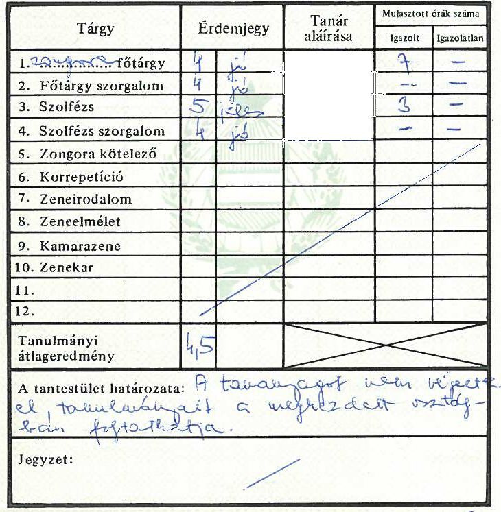 Mégis meghúztak. 4,5-ös átlaggal. Íme a bizonyíték, amit 7végén találtam otthon. A zeneiskolai bizonyítványom (Tananyagot nem végezte el, tanulmányait a megkezdett osztályban folytathatja):
