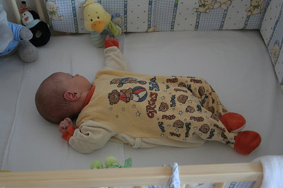 Rengeteget mozog a kiságyában, egyelőre. Háton nem alszik el, sokszor úgy feküdni se szeret, mert nekiáll hadonászni a kezével és rugdalózni.
