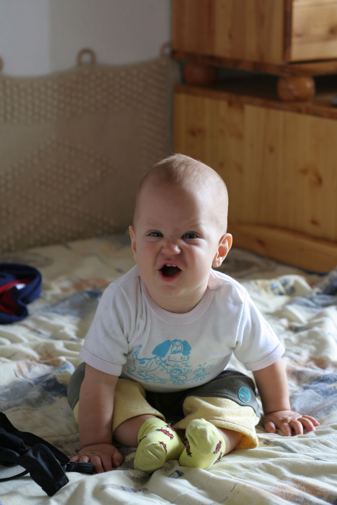 Szóval ma 10 hónapos a Babszem. A legfontosabb jellemzője, hogy most már kezd olyan igazán kisfiús-gyerekes jelleget ölteni a külseje. Még mindig a kommandós mozgás a menő (ülés, fekvés, forgás stb.), de egész jó az egyensúly érzéke. Feltérdel simán, sőt felemeli a fenekét, egyenes lábakkal, de még mindig hátrafelé tologatja magát és nem megy előre. Ezért aztán néha beragad ágy, fotel alá, sarokba, mert nem tud előre kijönni. Van hogy pár percig hagyom, hátha rájön a dolog ízére… de nem. Inkább követeli, hogy menjek és szabadítsam ki. Szeret a fenekén körbeforogni, felemelni egyszerre mindkét lábát, háton fekve a padlóhoz-ágyhoz verdesni a sarkát (az utóbbin élvezi, hogy visszarugózik). Bólogat, hogy igen-nem. Persze főleg ellentétesen, mint a szülők. Inkább poénból, mint igazán értelemmel töltve meg a gesztust. Ugyanígy valószínűleg poénból állt neki mostanában az orrhúzásos fintornak is. Párom arra a következtetésre jutott, hogy tőlünk leste el, mikor reggelente ásítunk, szörnyen viccesnek találta, hát ő is csinálja. Főleg hogy mi is röhögünk rajta. Integet, tapsol, megy a „fel a kezekkel” meg a „hol az okos fejed?” továbbra is gyakoroljuk a hogy morog a nagypapát is, nehogy elfelejtse mire jönnek a nagyszülők. Meg még biztos van egy csomó minden, ami most nem jut eszembe, pedig jó lenne, ha már egyszer itt dokumentálom a csemete fejlődését. Séta közben meg a legjobb amikor felhúzódzkodik, kihajol, hogy jobban megtekinthesse az őt érdeklő dolgokat (KRESZ táblák – főleg a lakó-pihenő övezetet kedveli -, kutyák, bokrok, építkezések, nagyobb autók, bicikliző gyerekek stb.) Még a tegnapihoz egy adat: 1610 fényképen szerepel. S íme a híres fintor, meg a felső 2 fog (azt hiszem, jön az 5. az éjszakai sűrű ébrenlét, szájban turkálás, nyáladzás erre enged következtetni):